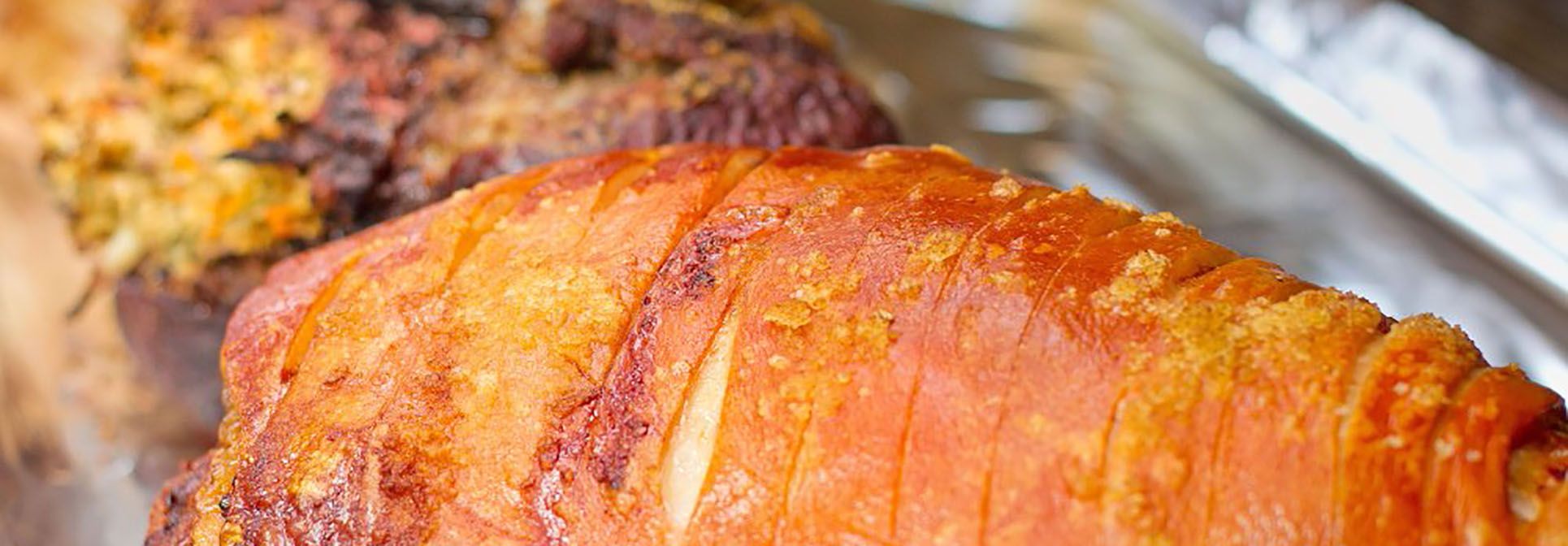 - Crisp crackling whole roast pork with tangy apple sauce